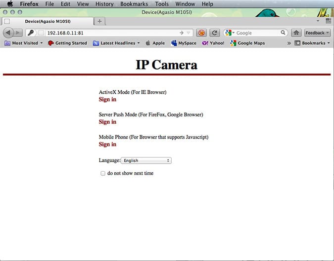 So now you’ve identified the camera’s LAN IP address. Punch it into your web browser, followed by :81 (port 81). For some strange reason, Easy N Tech decided to make the web server port 81 instead of the standard port 80. For example, my IP Camera’s IP address was assigned 198.168.0.11 by my router, I would type in http://198.168.0.11:81 on my web browser.