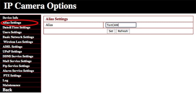 If you would like to rename your IP Camera to something more task designated, click on “Alias Settings” and enter a new name. My Agasio M105I outdoor IP camera was purchased to monitor my Sulcata and Red Foot tortoises, so I named the camera “TortCAM” as follow: