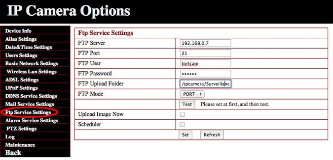 In order to have the IP Camera take screenshots and save it to a hard drive, either due to triggering the motion detector or because the Scheduler was configured, an FTP server and folder must be entered. Click on “FTP Service Settings” to continue: