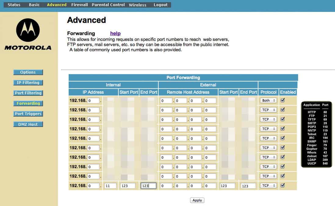 Once you have this information, you’ll need to select a public port to assign to the IP Camera. If your public ISP assigned IP address is 123.456.789.012 and we’ve already assigned it port 123 in the initial setup, you’ll need to punch in http://123.456.789.012:123 in your web browser. But before you can do that, you need to configure your router and instruct it to forward the PUBLIC port and map it to the IP Camera in your PRIVATE local area network. This process depends on what router you are using. I’ll illustrate this on a Motorola SURFboard cable modem / router and a first generation Apple Time Capsule with built-in AirPort Express.