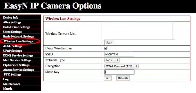 So back to the setup procedure, once you get your IP Cam up and running on the LAN, go to your IP Cam’s web UI and click on “Wireless Lan Settings” on the left navigation menu to configure the IP Cam for wireless access.