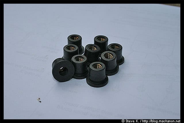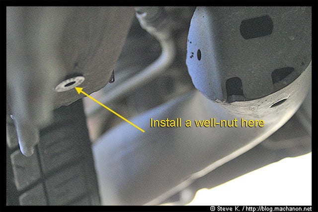 Push in a well nut to the four holes along the under side of your car. The first three holes were occupied by the clips you’ve removed earlier. The fourth hole is the hole you’ve just recently drilled: