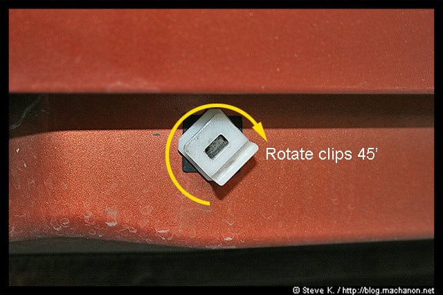 Remove the clips by rotating them 45-degrees and pulling them out: