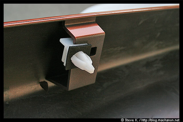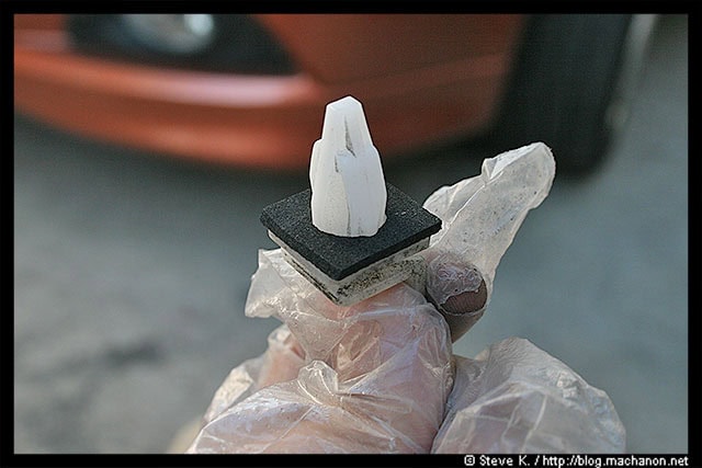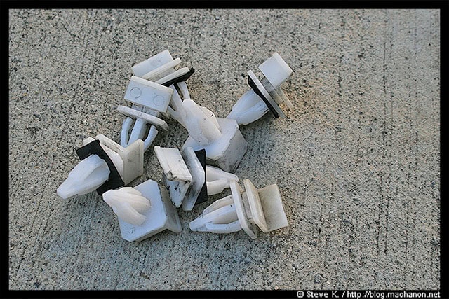 Some of these clips you’ve removed may have rubber backing removed along with it. Some may be stuck to the body. Either way, remove and discard the old rubber backings and slide in a new rubber backing into each clip:
