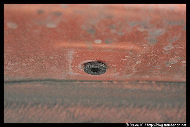 Install a 5th well nut into a pre-existing hole located at the rear end of the side, near the rear wheel well. It’s located directly in front of the hole you’ve plugged with the blind plug. Push a well nut into this hole as illustrated: