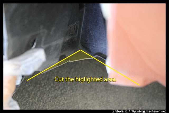 Next, take a pair of shrub trimmer and cut out a small part of your front inner fender to make room for the A-Spec side spoiler. Cut along the marked location: