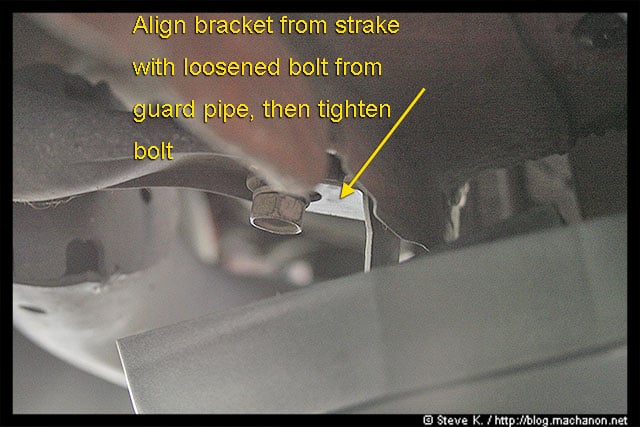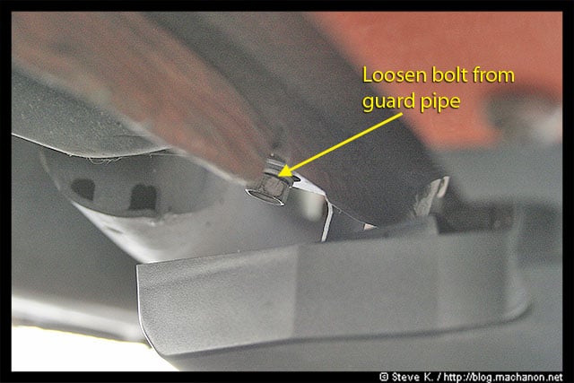 Then you want to slide the bracket on the left strake in between the guard pipe and the 12mm bolt. Once you’ve accomplished this, tighten the bolt back in place:
