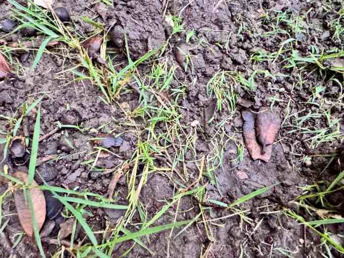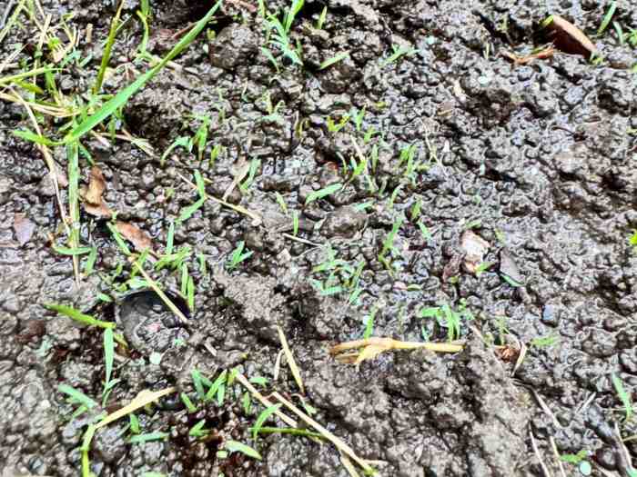 Just when I thought the rain had finally let up, it poured for another three days. The seedlings definitely took a beating, as shown in the photos below. Fortunately, the soil drains well—pooled water usually disappears within 30 minutes, leaving no standing water behind. That said, several patches, especially the youngest ones, were displaced or washed away since their roots hadn’t yet taken hold.